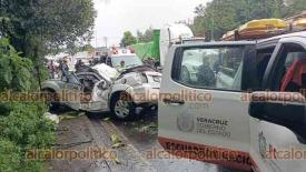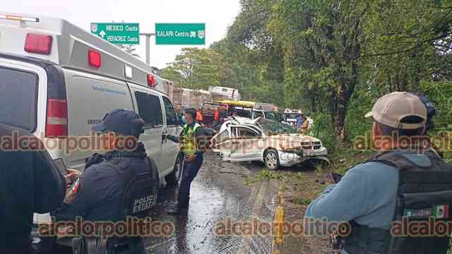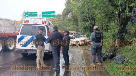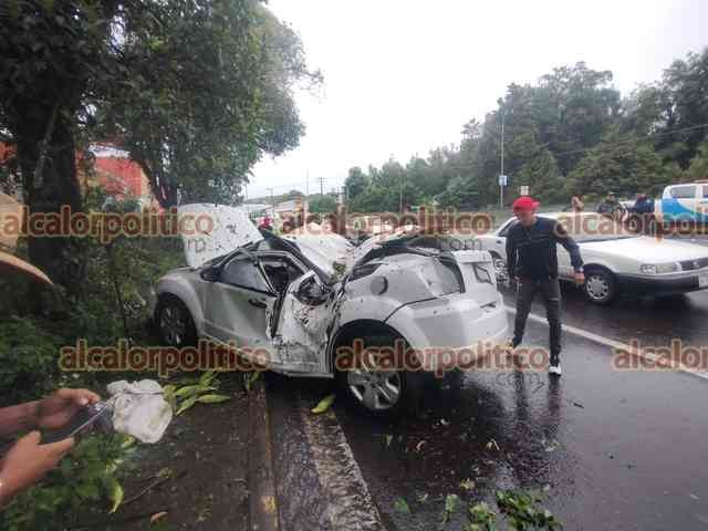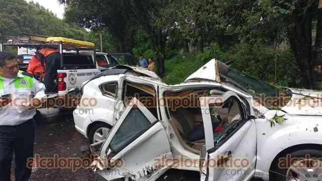 Banderilla, Ver., 16 de junio de 2025.- En la carretera Banderilla-Xalapa, camión de carga le pegó a automóvil, el cual quedó destrozado tras volcar. Tres personas que habían quedado prensadas fueron llevadas de urgencia a un hospital.