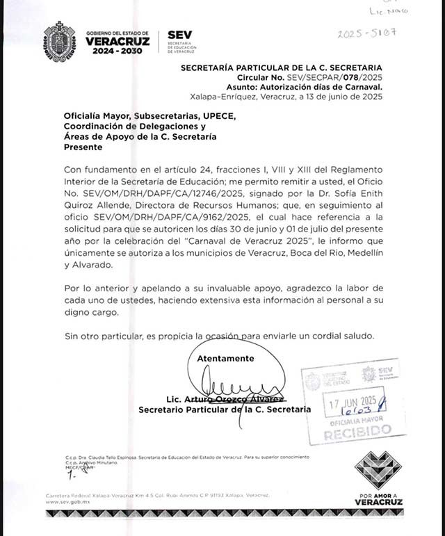 Xalapa, Ver., 17 de junio de 2025.- Aunque el calendario de descansos de la SEV para junio 2025-mayo 2026 (imagen izq.) se incluía a Xalapa por la celebración del Carnaval de Veracruz, un oficio emitido por la dependencia este martes aclara que sólo Veracruz, Boca del Río y Medellín de Bravo tendrán de asueto este 30 y primero de julio.