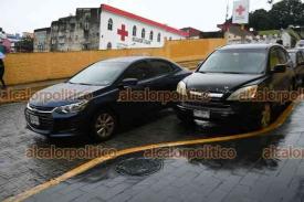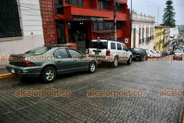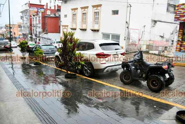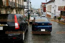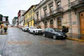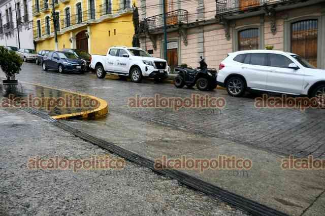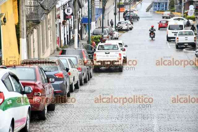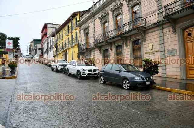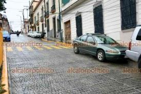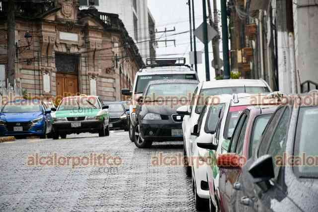 Xalapa, Ver., 8 de octubre de 2025.- A pesar de que el Ayuntamiento edificó la calle Clavijero con bahías para que se estacionaran los vehículos, automovilistas se estacionan en doble fila, complicando el tráfico.