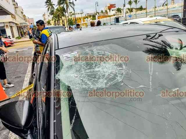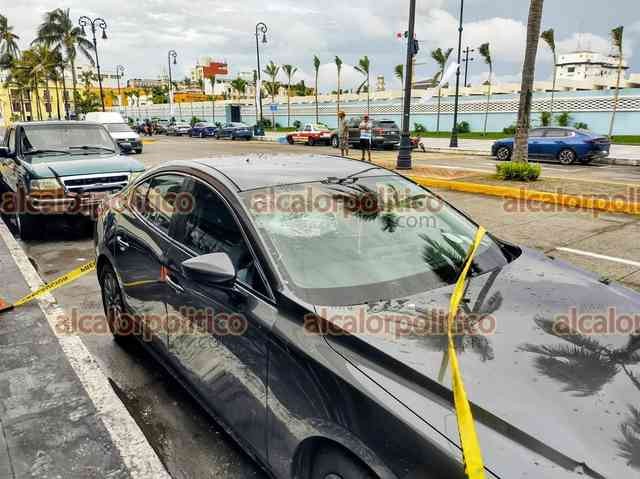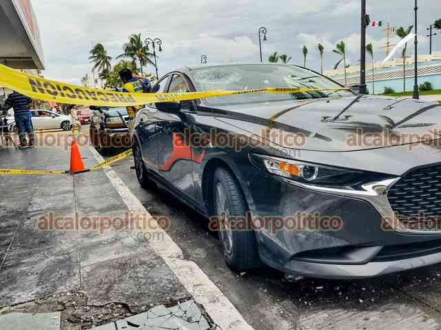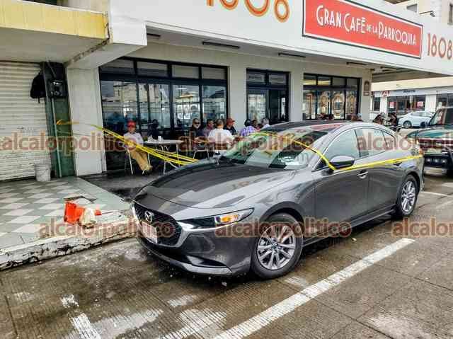 Veracruz, Ver., 8 de octubre de 2025.- Partes de la cornisa de La Parroquia de Veracruz del malecón cayeron sobre auto Mazda 3 estacionado sobre el Paseo Insurgentes Veracruzanos. Acudió PC Municipal para acordonar el área. El encargado del restaurante aseguró que se harán responsable de los daños.
