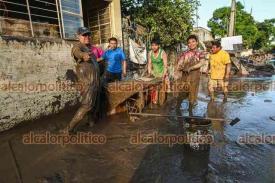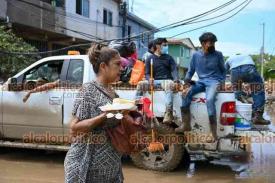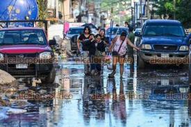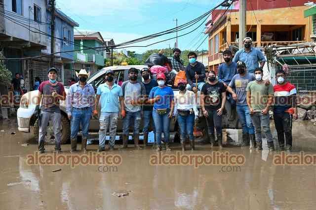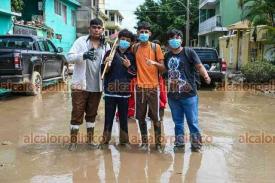 Poza Rica, Ver., 13 de octubre de 2025.- Estudiantes de preparatoria y universitarios se organizaron para ayudar a limpiar casas y cuartos de compañeros afectados por la inundación. En la colonia Morelos, zona estudiantil, trabajan armados con palas, escobas y cubetas.