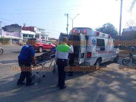 Xalapa, Ver., 3 de diciembre de 2025.- Taxi y una mujer repartidora de pizzas que iba en moto chocaron en la avenida Maestros Veracruzanos, esquina con Adalberto Tejada, en el fraccionamiento Pomona. Paramédicos atendieron a la lesionada, mientras que personal de Tránsito del Estado hizo el peritaje.