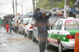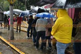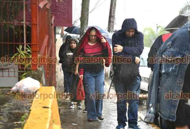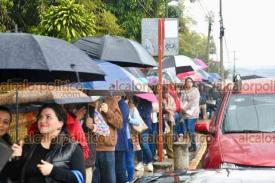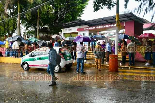 Xalapa, Ver., 8 de diciembre de 2025.- Bajo el agua, este lunes docentes de la Capital, Coatepec y Veracruz Puerto hacen fila afuera de la SEV para recibir nueva tarjeta bancaria con la que se implementa la Nómina Única. Se dijeron molestos por esta situación.