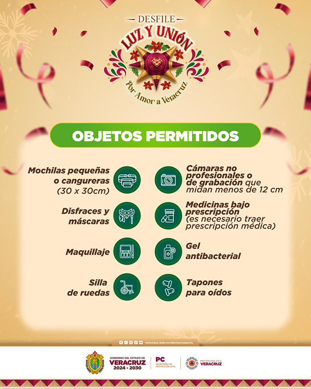 Xalapa, Ver., 19 de diciembre de 2025.- La Secretaría de Seguridad Pública dio a conocer a quienes asistirán al desfile navideño “Luz y Unión: Por Amor a Veracruz” la lista de los objetos permitidos y prohibidos.