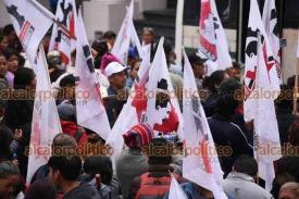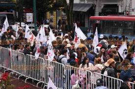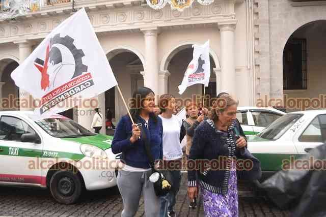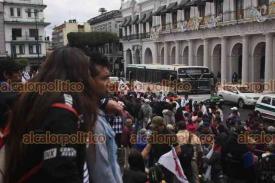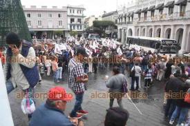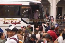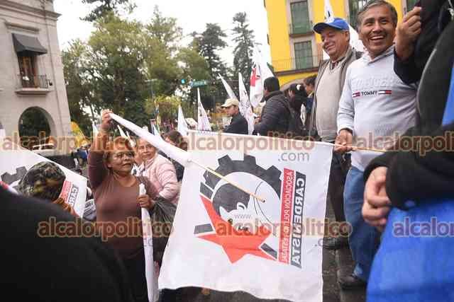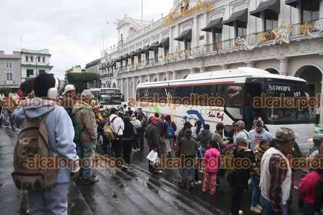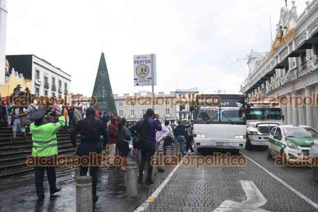 Xalapa, Ver., 22 de diciembre de 2025.- Cardenistas llegaron en autobuses a la plaza Lerdo para demandar al Gobierno del Estado la regularización de predios, entre otras exigencias.