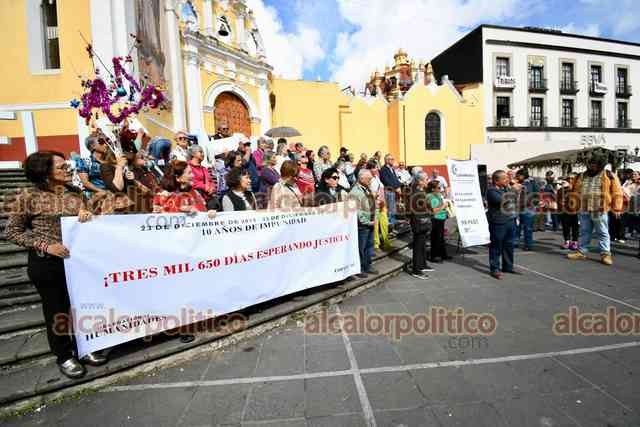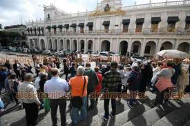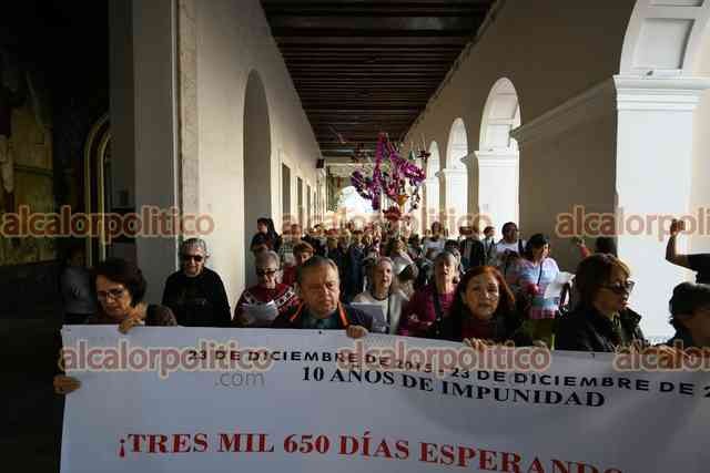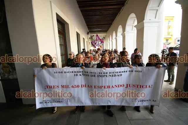 Xalapa, Ver., 23 de diciembre de 2025.- Integrantes de la COPIPEV se manifestaron en la Plaza Lerdo para exigir justicia a 10 años del desalojo que sufrieron en 2015 por parte de policías estatales, durante el Gobierno de Javier Duarte.