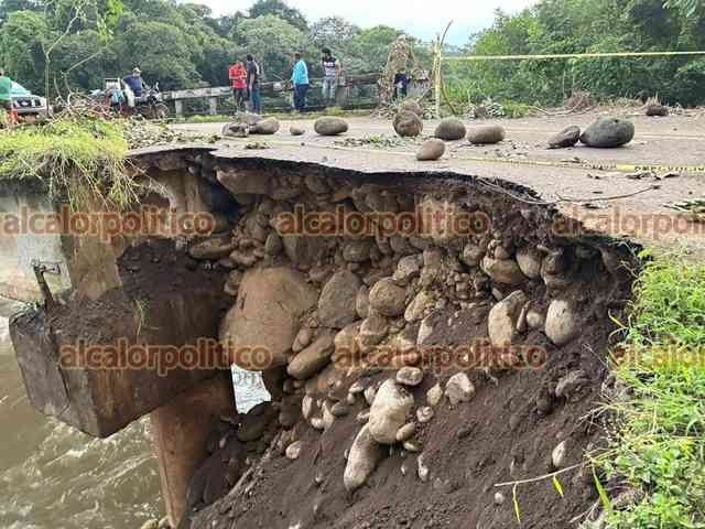 Tatahuicapan, Ver., 23 de diciembre de 2025.- La creciente del río Tecuanapa socavó el aproche del puente que comunica a comunidades de la Sierra de Santa Marta; parte de la carretera también está dañada, por lo que se prevé riesgo para quienes transiten por esta vía.