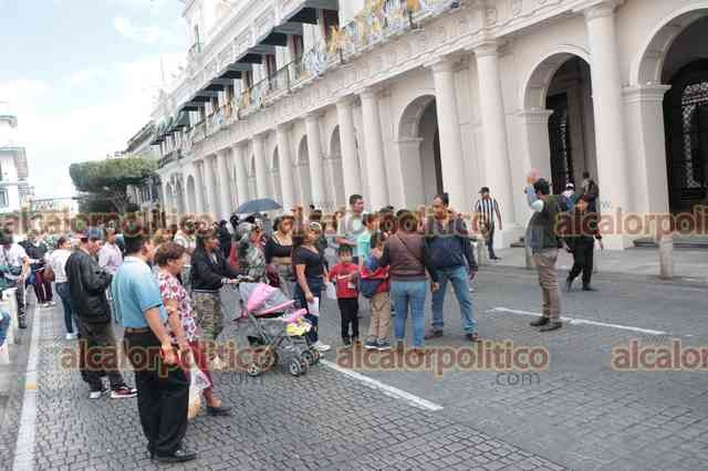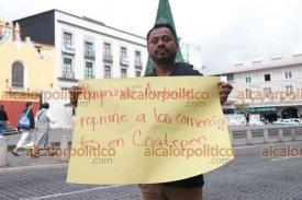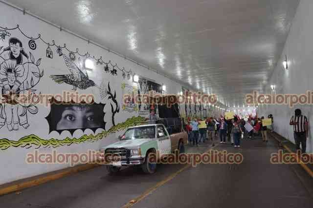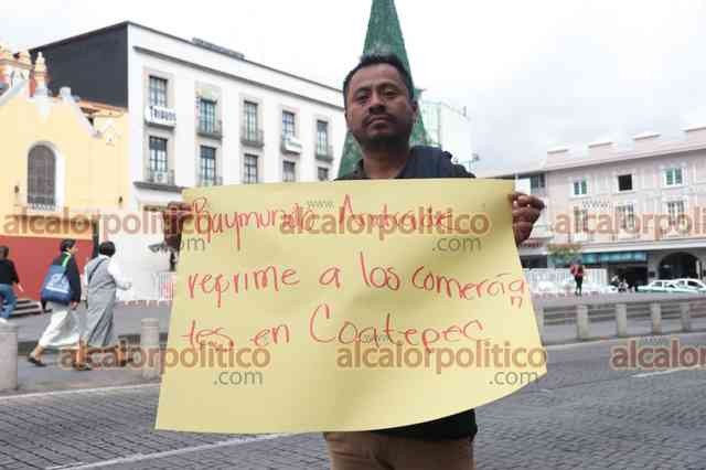 Xalapa, Ver., 27 de diciembre de 2025.- Vendedores afiliados al Movimiento Antorchista, bloquearon por unos minutos la calle Enríquez y marcharon por las calles del centro en protesta por el desalojo en Coatepec por parte de policías municipales.