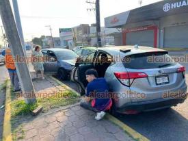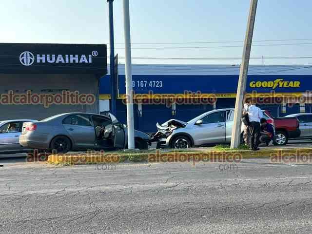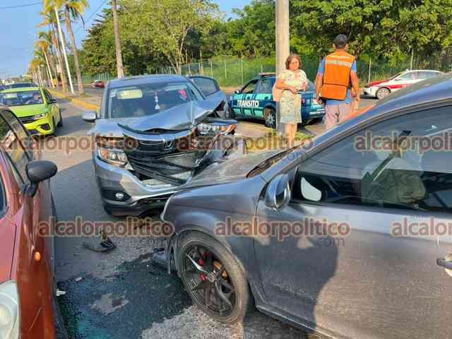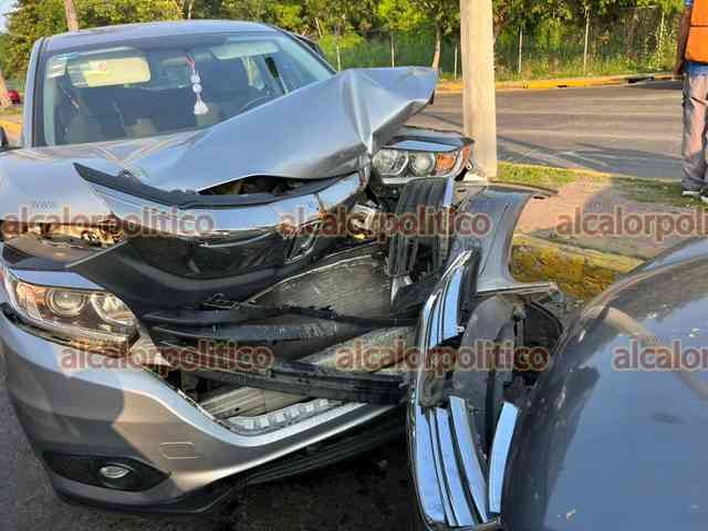 Veracruz, Ver., 28 de diciembre de 2025.- En la avenida Miguel Alemán, joven conductor perdió el control de su vehículo y se estrelló de frente contra otro automóvil que esperaba el verde del semáforo.