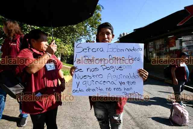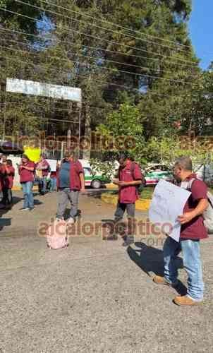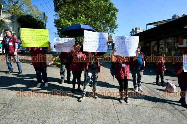 Xalapa, Ver., 2 de enero de 2026.- Trabajadores de la empresa Limpieza Especializada Industrial y Hospitalaria (LEIH) de varios centros de salud y nosocomios bloquearon la calle Soconusco, frente al CECAN, en protesta por la falta de pago de quincena y aguinaldo.