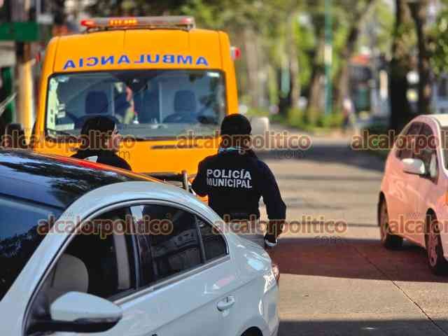 Xalapa, Ver., 2 de enero de 2026. Conductora perdió el control de su auto en la intersección de avenida Américas y Paricutín y terminó sobre una jardinera. Paramédicos de la Policía Municipal atendieron a la mujer por algunos golpes que sufrió.