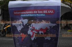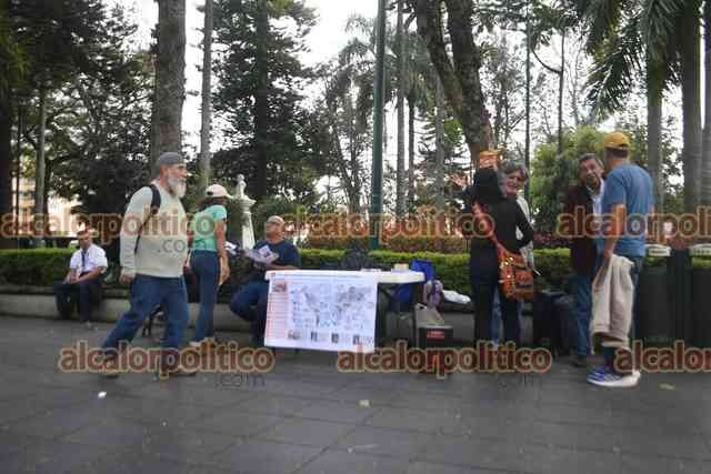Xalapa, Ver., 10 de enero de 2026.- Activistas colocaron un módulo de información en el parque Juárez de esta ciudad, con la intención de comunicar a los ciudadanos la actual situación que prevalece por la intervención de Estados Unidos en Venezuela.