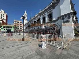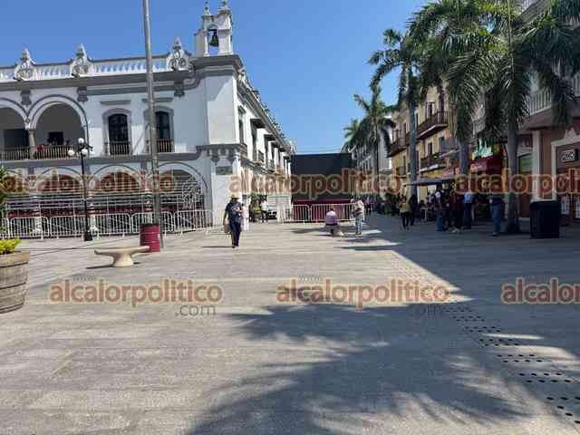 Veracruz, Ver., 10 de febrero de 2026.- Así luce el Zócalo previo a la Quema del Mal Humor este martes a las 20:00 horas, donde la figura a quemar será el “bache”. Hay gradas para los asistentes y pantallas.