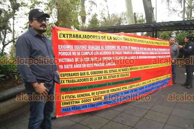 Xalapa, Ver., 16 de febrero de 2026.- Extrabajadores de la SSP protestan frente a Palacio de Gobierno. Acusan que los acuerdos para los pagos no se cumplieron y señalan que la carpeta se perdió tras las inundaciones de Poza Rica.