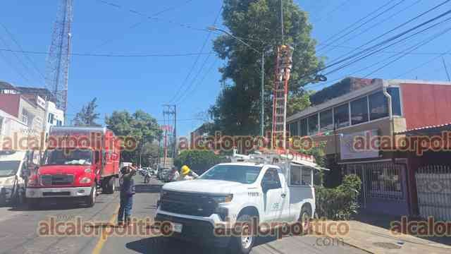Xalapa, Ver., 27 de febrero de 2026.- Camión de una cervecera provocó el cierre de la avenida Miguel Alemán cerca del mediodía de este viernes al jalar cables de luz.