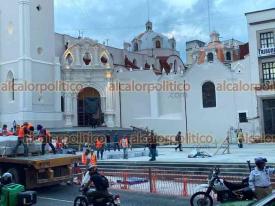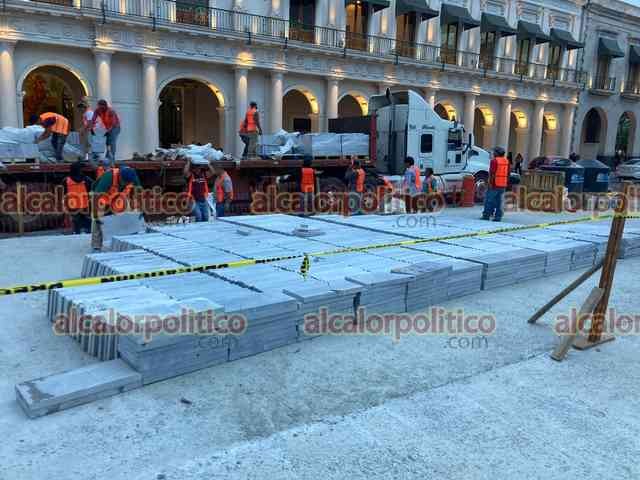 Xalapa, Ver., 4 de marzo de 2026.- Durante los trabajos en la plaza Lerdo fue descargado lo que será el nuevo revestimiento del suelo. No es mármol; es del mismo tipo usado en el Palacio de Gobierno.