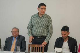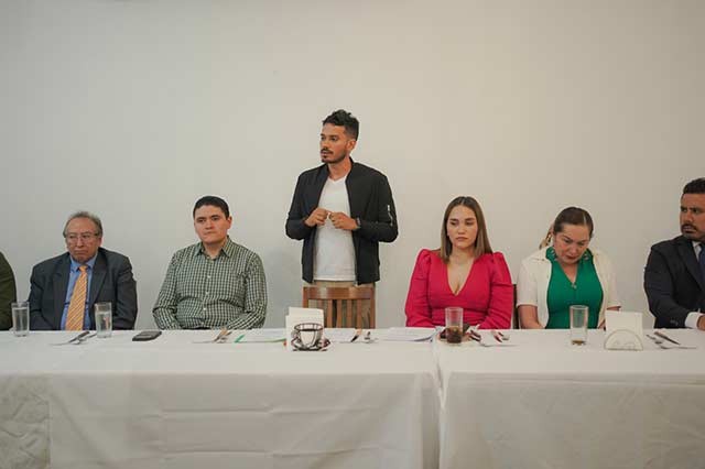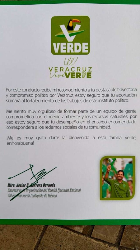 Xalapa, Ver., 6 de marzo de 2026.- Este jueves, el dirigente estatal del Partido Verde, Édgar Lendechy Herrera (d), le tomó protesta a Reynaldo Escobar Estudillo como coordinador de activismo político del PVEM en esta ciudad capital.