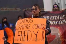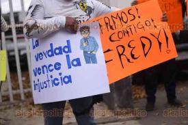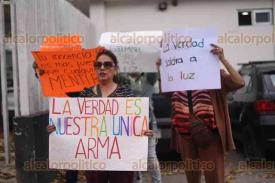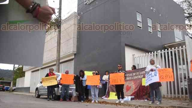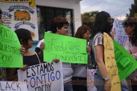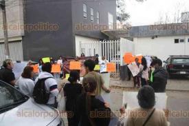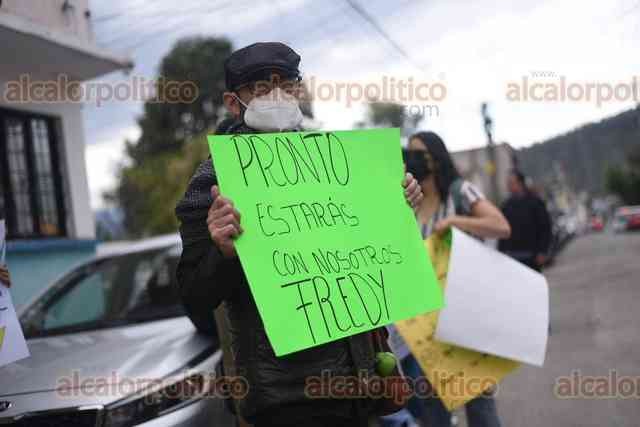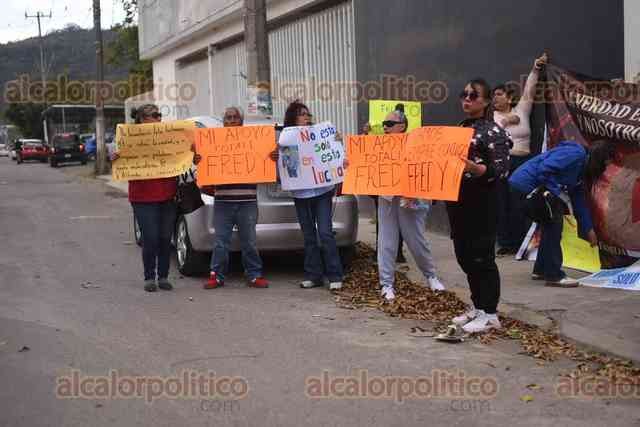 Coatepec, Ver., 12 de marzo de 2026.- Familiares, conocidos, exalumnos, madres y padres de familia se manifestaron afuera de los juzgados de Pacho Viejo para expresar su respaldo al profesor de artes plásticas Alfredo “N”, detenido por el delito de pederastia agravada.