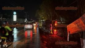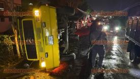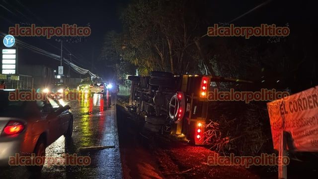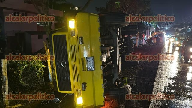 Emiliano Zapata, Ver., 16 de marzo de 2026.- Un camión cañero volcó en la carretera Las Trancas–Coatepec, la noche de este lunes, a la altura de la colonia Santa Lucía; el conductor abandonó la unidad antes de la llegada de los servicios de emergencia, no hubo lesionados