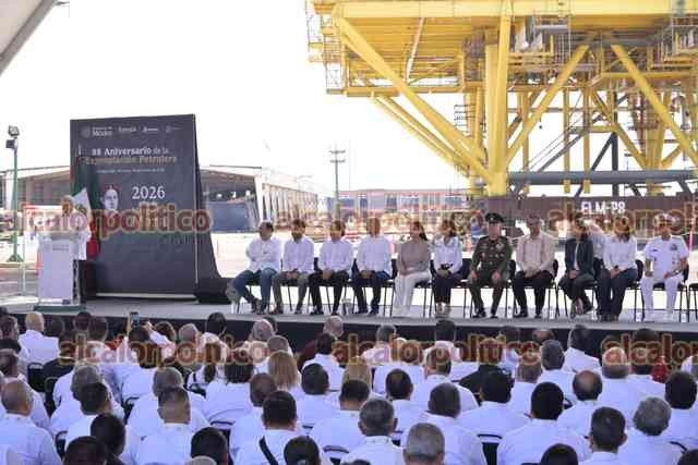 Pueblo Viejo, Ver., 18 de marzo de 2026.- Con la presencia de Cuauhtémoc Cárdenas Solórzano, la presidenta Claudia Sheinbaum encabezó el evento por el 88 Aniversario de la Expropiación Petrolera. Asistieron los gobernadores de Veracruz y Tamaulipas, Rocío Nahle y Américo Villarreal; los titulares de SEDENA, Ricardo Trevilla; de SEMAR, Raymundo Morales; de SENER, Luz González; de Bienestar, Ariadna Montiel, y el director de PEMEX, Víctor Rodríguez.