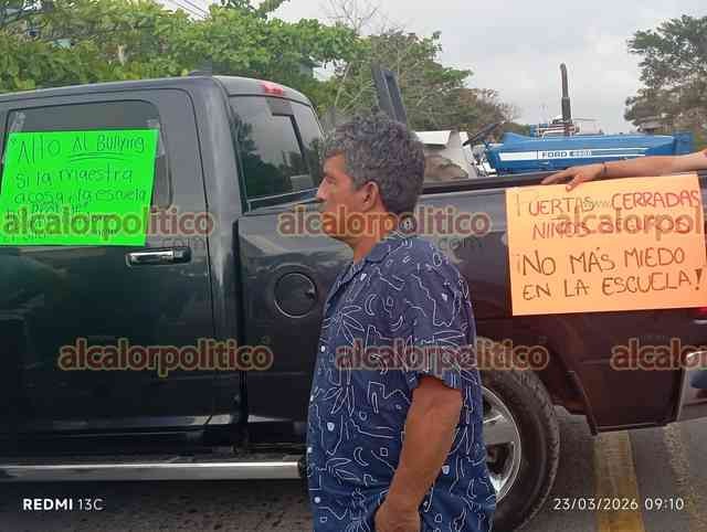 Tecolutla, Ver., 23 de marzo de 2026.- Padres de familia de la Escuela Primaria “Constitución”, de la comunidad de La Guadalupe, bloquearon la carretera federal 180, frente al plantel, para demandar que la Directora sea removida pues desatiende casos de bullying.