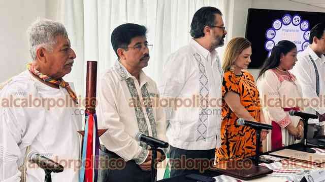 Papantla, Ver., 10 de abril de 2026.- El ministro presidente de la SCJN, Hugo Aguilar Ortiz, encabezó el inicio del programa de la Defensoría Pública Electoral del TEPJF junto al presidente, Gilberto Bátiz; integrantes del órgano de administración judicial y Guadalupe Simbrón García, director del Centro de las Artes indígenas. Representantes indígenas hicieron un ritual para el éxito.