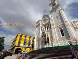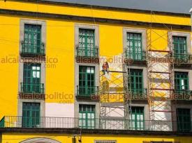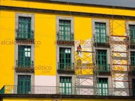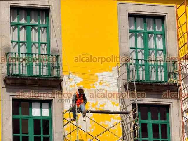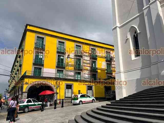 Xalapa, Ver., 17 de abril de 2026.- En el edificio Nachita, trabajadores reemplazan su característico color amarillo por tono similar a la Catedral Metropolitana y Palacio de Gobierno.