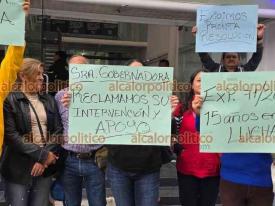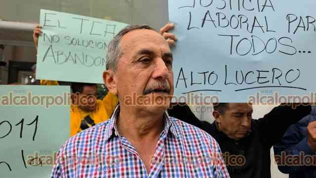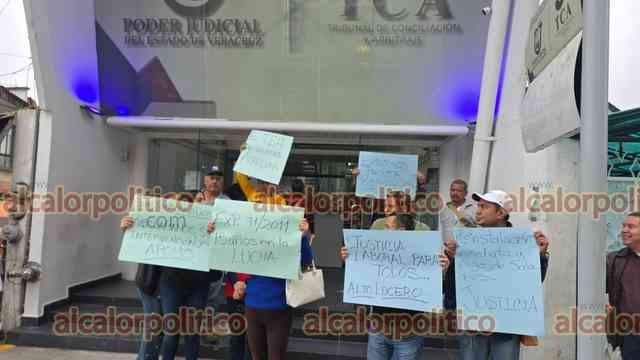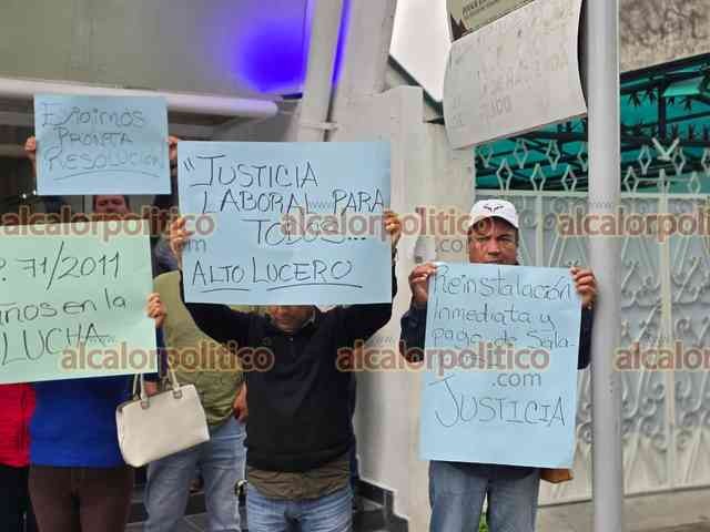Xalapa, Ver., 21 de abril de 2026.- Extrabajadores del Ayuntamiento de Alto Lucero despedidos en 2011 se manifestaron a las afueras del Tribunal de Conciliación y Arbitraje para recriminar que desde hace 15 años no logran justicia en su caso de laudos laborales.