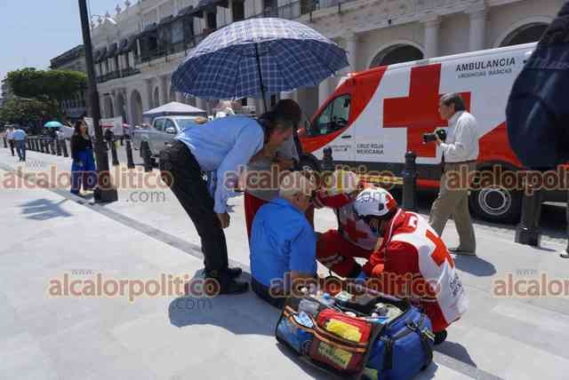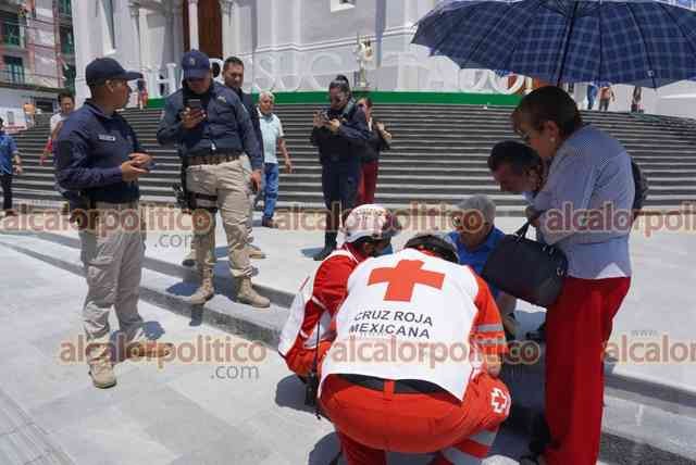 Xalapa, Ver., 23 de abril de 2026.- Adulto mayor fue atendido por paramédicos de la Cruz Roja luego de que resbalara en escalón de plaza Lerdo.