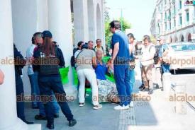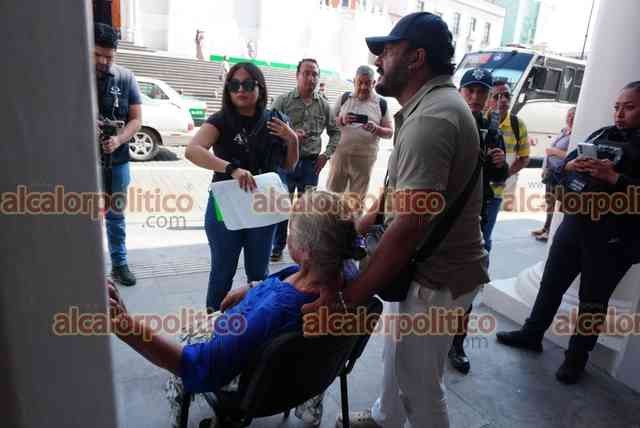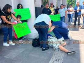 Xalapa, Ver., 28 de abril de 2026.- Una de las personas que se manifestaban bloqueando la calle Enríquez se desmayó, por lo que fue auxiliada por paramédicos frente al Palacio de Gobierno.