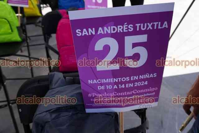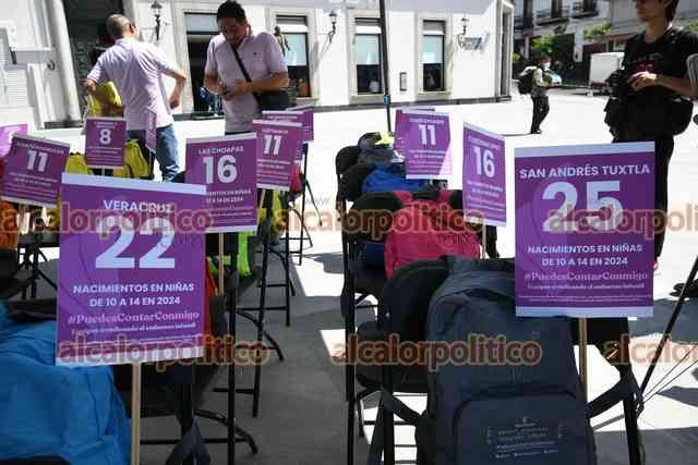 Xalapa, Ver., 28 de abril de 2026.- En la Plaza Lerdo, con sillas, mochilas y letreros con estadísticas municipales, activistas de Equifonía buscan concientizar acerca de la problemática de embarazos infantiles en el Estado.