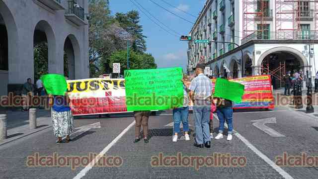 Xalapa, Ver., 28 de abril de 2026.- Familiares y exagentes de la extinta Policía Intermunicipal Poza Rica-Tihuatlán-Coatzintla bloquearon por varios minutos la calle Enríquez, en el centro de la Capital, para exigir al Gobierno del Estado el cumplimiento de pago pendientes.