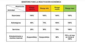 Cuando una demarcación se encuentre en semáforo amarillo (en “riesgo medio”), las actividades de entretenimiento y eventos masivos abrirán con un aforo del 50 por ciento; servicios al 70 por ciento; mientras que el rubro estratégico y esenciales al 100 por ciento.