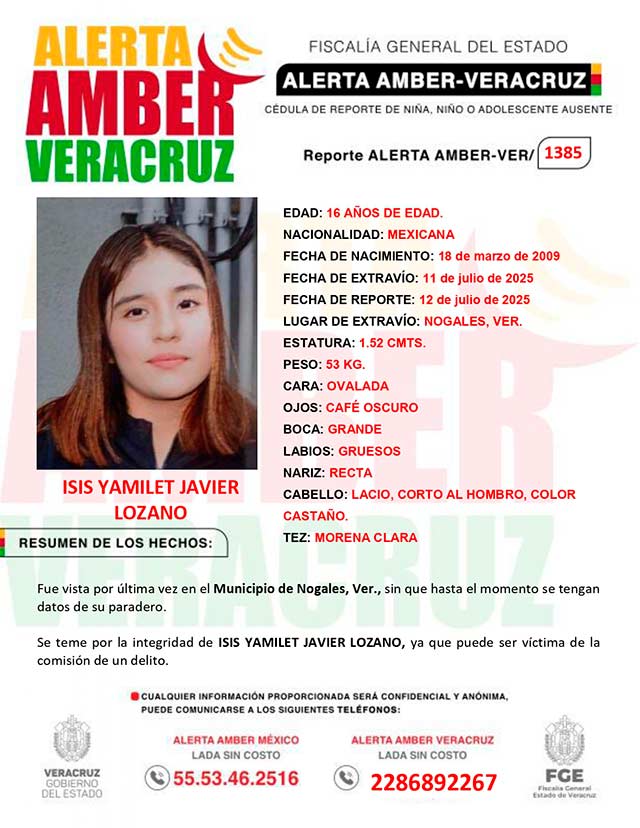 ALERTA AMBER- VERACRUZ 1385por la adolescente ISIS YAMILET JAVIER LOZANO,de 16