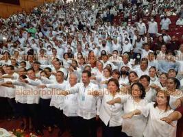 En su mensaje a la Sección 32, Covarrubias exigió a la Secretaría de Educación de Veracruz que aplica una verdadera descarga burocrática de la oficina central a las sedes regionales, y cumplan con el propósito para el que fueron hechas.