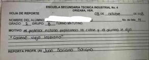 vox populi. Un ejemplo de lo anterior es el reciente caso de una estudiante de la Escuela Secundaria Técnica Industrial No. 4, en Orizaba, Veracruz, reportada por su profesor, Juan Soriano, luego de que ésta le dijera: “cállese, viejo lesbiano”, frente a todo el grupo.
