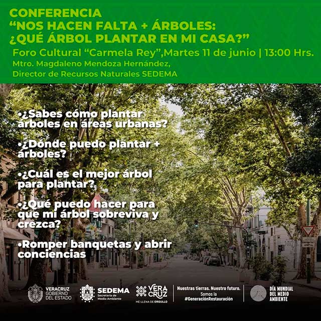 Te esperamos en el Foro Cultural Carmela Rey a las 13:00 horas,en la Conferencia "Nos Hacen Falta + Árboles" donde podrás conocer las mejores opciones de árboles para plantar en tu banqueta o jardín.