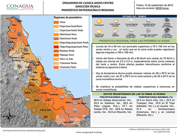 El centro del huracán “Ingrid” se localizó a las 07:00 horas de hoy en 22.5°N y 95.6°W, aproximadamente a 272 km al este-noreste de Pánuco, Veracruz. Este sistema se desplaza hacia el noreste a razón de 8 km/h, con vientos máximos sostenidos de 105 km/h. Su circulación transporta nubosidad sobre la región; así como favorece viento de componente norte con algunas rachas fuertes en la zona costera del norte y centro.