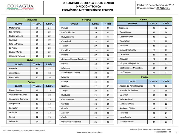 Se prevé que el centro de “Ingrid” se localice a las 13:00 horas de hoy en 22.9 °N y 96.1°W, aproximadamente a 235 Km al este-noreste de Pánuco. De acuerdo con la última actualización del Centro Nacional de Huracanes, se espera que este meteoro se intensifique a categoría dos en la escala de Saffir-Simpson antes de impactar tierra en un punto comprendido entre La Pesca y Tampico, Tamaulipas.