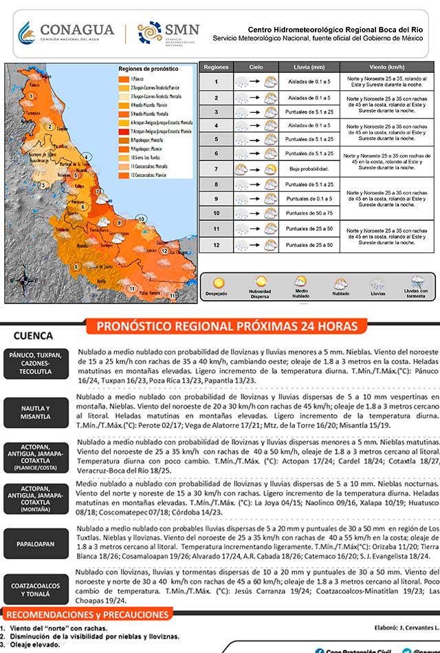 Lunes con ambiente frío al amanecer; nublado a medio nublado con probabilidad de lluvias dispersas en especial en cuencas del sur, nieblas y lloviznas en el resto del Estado; las temperaturas diurnas incrementarán ligeramente; el viento del noroeste con rachas que irán decreciendo.