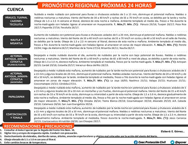 Una vaguada prefrontal sobre el suroeste del Golfo de México anticipa el aumento de nublados y el viento del Norte con rachas de 40 a 50 km/h entre Misantla y Xalapa, previendo que el Frente Frío Núm. 34 (actualmente sobre el sur de Tamaulipas) cruce gran parte del mismo golfo y territorio veracruzano durante este día, para extender los nublados y las condiciones de nieblas, lloviznas y lluvias aisladas en la entidad, esperando acumulados generales de 5 a 15 mm y algunos locales de 20 a 30 mm en montañas y zona sur.