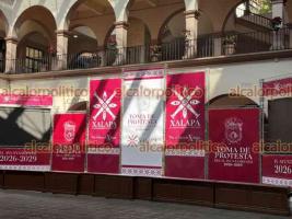 Con el lema “Por el Bien de Xalapa” al frente y en el centro, el equipo de la alcaldesa electa Daniela Guadalupe Griego Ceballos instaló el escenario para la toma de protesta en el edificio del Ayuntamiento.