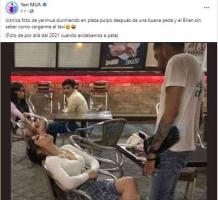 "Icónica foto de Yeri MUA durmiendo en Plaza Pulpo después de una buena peda y el Brian sin saber como cargarme al taxi. (Foto de por allá del 2021 cuando andábamos a pata)", publicó en redes junto con la imagen.