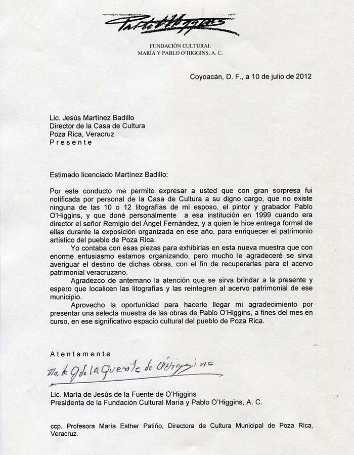 Es entonces, que en julio del 2012, la presidenta de la Fundación, María de la Fuente Viuda de O´Higgins, emitió una carta al entonces director de Casa de Cultura, Jesús Rodríguez Badillo, la necesidad de localizar las 10 litografías que se donaron a este municipio, cuyo fin era enriquecer el patrimonio artístico del pueblo pozarricense.