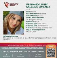 Este día la Comisión Estatal de Búsqueda se pronunció al cumplirse 13 años de la desaparición de Fernanda Rubí Jiménez Salcedo, hija de la representante del Colectivo de Familias de Desaparecidos zona Orizaba-Córdoba, y enfatizó en su red social que la sigue buscando.