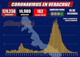 Luego de practicar 278 mil 135 estudios, la Secretaría de Salud (SS) ha confirmado 124 mil 238 (+22 nuevos) casos de COVID-19 en Veracruz, 162 de éstos activos y 178 sospechosos actuales.