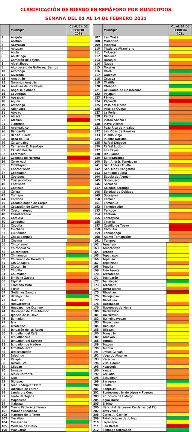 El secretario de Salud de Veracruz, Roberto Ramos Alor, dio a conocer que cinco municipios más pasan a semáforo epidemiológico rojo de COVID-19, en los próximos 15 días, por lo que las demarcaciones en riesgo máximo suman ahora doce.