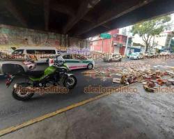Los hechos ocurrieron cuando el vehículo que transportaba mercancía de abarrotes sobre la avenida golpeó con la carga la parte baja del puente, dejando regadas cajas completas de mercancía.