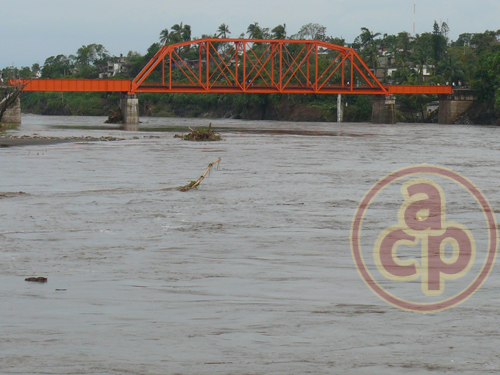 El puente del ferrocarril que une a los municipios de La Antigua y Paso de Ovejas, a su paso por Ciudad Cardel, con una altura del río hacia su estructura o vías férreas de casi 10 metros, la creciente le llegó a ras durante la madrugada del sábado. Aquí se aprecia ya en descendencia durante el día