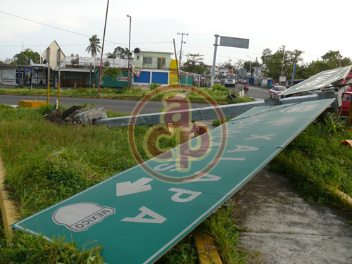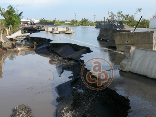 La autopista Cardel-Veracruz fue afectada al meterse el agua del crecido río La Antigua que se desbordó y era tanta la fuerza de la corriente que el muro central lo derribó; esto a la altura de San Pancho.